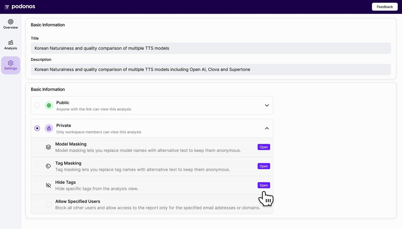 Keep reports clean without losing important context.You can now hide specific tags from your report pages while keeping them intact in the evaluation setup. This makes it easier to share reports externally without exposing internal or experimental metadata.- Hide selected tag(s) from the report UI